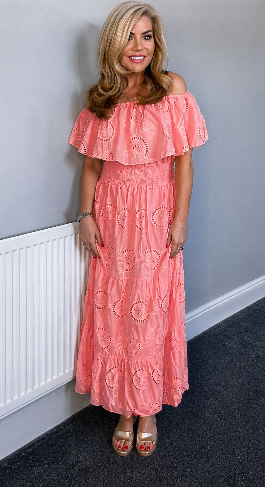 'Belle' all over embroidery Bardot dress pink- Regular price