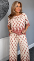 NEW IN.... oh we love! Elasticated waist border print trousers with a half sleeve matching top that can be worn on or off the shoulders...in the most gores lightweight fabric, can be dressed up or down