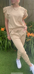 This co-ord is an update from our Summer short set. It is soooo comfy with a cuffed jog and a frill short sleeve tee, it is the go to transitional co-ord. School run, airport outfit, running the shops, Sunday vibes - Polly has it all!